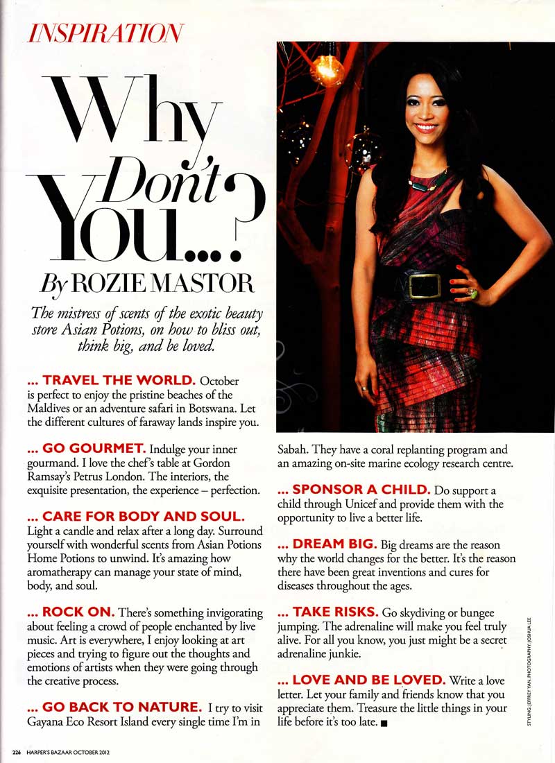 The exotic beauty store Asian Potions, on how to bliss out, think big, and be loved. Harpers Bazaar Magazine, Oct 2012 |